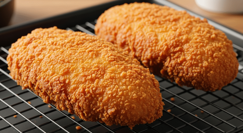 - Control oil heat (325–350°F) and fry in batches. Too cool = greasy; too hot = scorched crust, undercooked center. Confirm doneness with a thermometer (poultry is safe at 165°F).