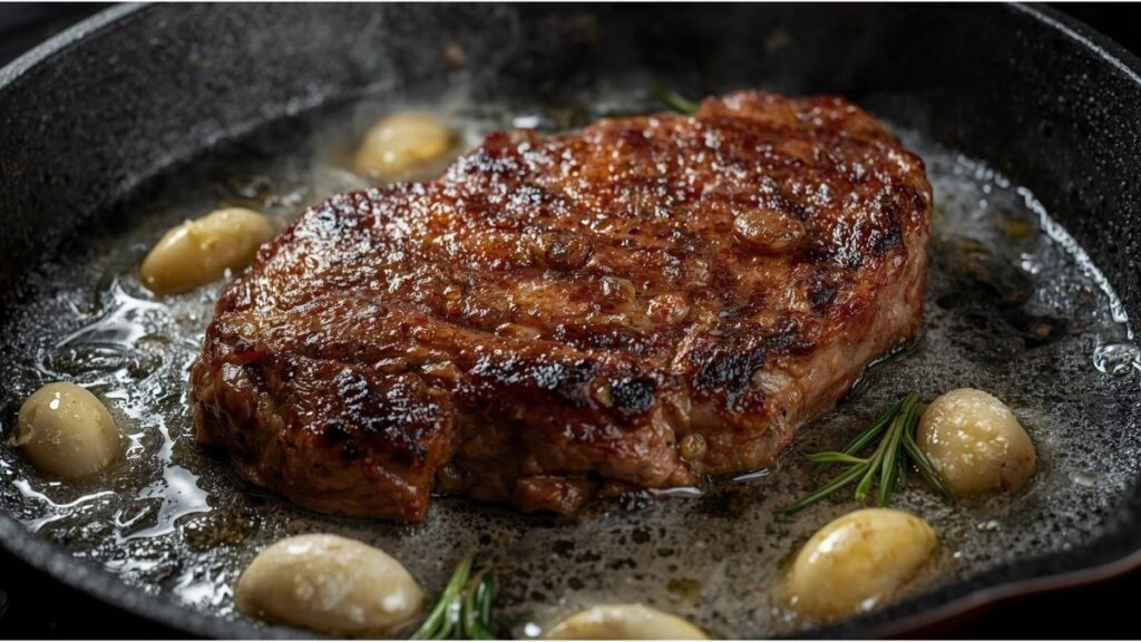 - Add a knob of butter, crushed garlic, thyme, and rosemary to the skillet, spooning the melted butter over the steaks for an extra flavor infusion.