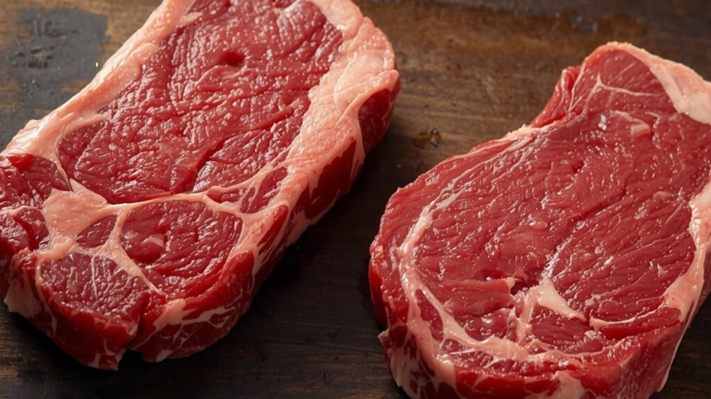 - Strip Steak: leaner, with firm texture and bold beef flavor.