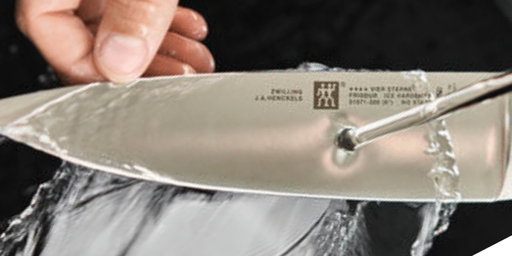 Henckels’ NO STAIN stainless steel resists rust and discoloration, but neglect can still lead to pitting or edge damage. Follow the brand’s care guidance for washing, drying, and storage (official care guide).